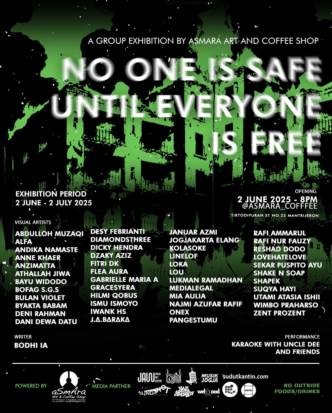 Pameran ini adalah seruan dari bilik-bilik jeruji pembungkaman, dari mulut-mulut yang ditutup namun pikirannya pantang menyerah. 47 seniman dari berbagai penjuru menyuarakan perihal pengungsian, penindasan, pembungkaman. Lewat berbagai macam ekspresi artistik mereka mengajak kita untuk tak sekadar melihat, tapi juga merasakan berbagai macam sensor, pelarangan imajinasi, kriminalisasi, dan peristiwa-peristiwa pengekangan akal manusia. sebab apa yang kami himpun dalam Asmara Art bukan hanya ruang pameran karya seni. kami membuka peristiwa ini sebagai ruang bersaksi.Karena tubuh yang dipenjara tak pernah bisa benar-benar dikalahkan, selama suaranya menemukan jalan untuk pulang ke hati kita."