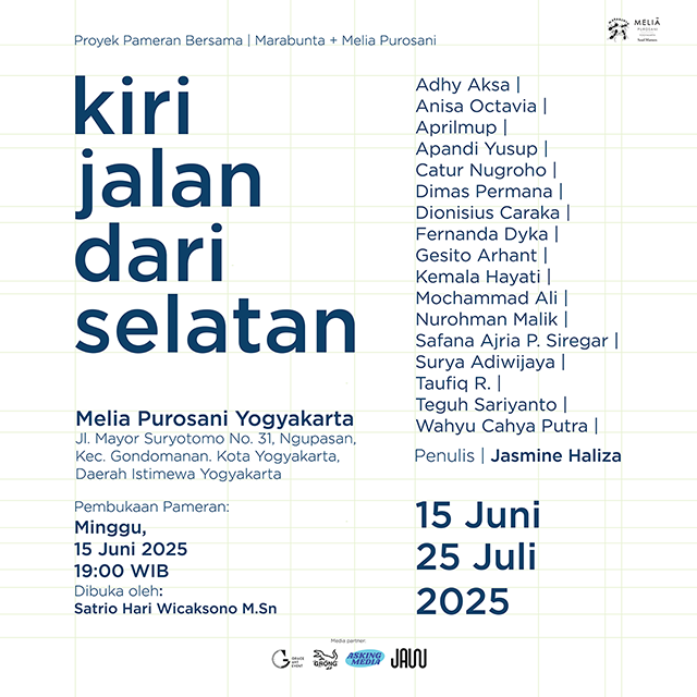Pameran "Kiri Jalan dari Selatan" merupakan project kolektif Koloni Marabunta yang berkolaborasi dengan Melia Purosani. Project ini bertemakan "Sonder", sebuah istilah yang menggambarkan kesadaran bahwa setiap orang yang kita temui menjalani hidup yang begitu kompleks dan penuh emosi, sebanding dengan cerita kita sendiri. "Kiri Jalan dari Selatan" adalah sebuah refleksi yang menggali longing, ambience, romance, dan puisi yang terjalin dengan kehidupan sehari-hari. Perjalanan kecil ini, seolah remeh, sebenarnya adalah cara kita menyadari bahwa kita adalah bagian dari ia yang tak pernah kehilangan jiwanya. Melalui karya seni yang ditampilkan, kita diajak untuk merenungi pengalaman kolektif sebagai penghuni dan penjelajah kota ini.