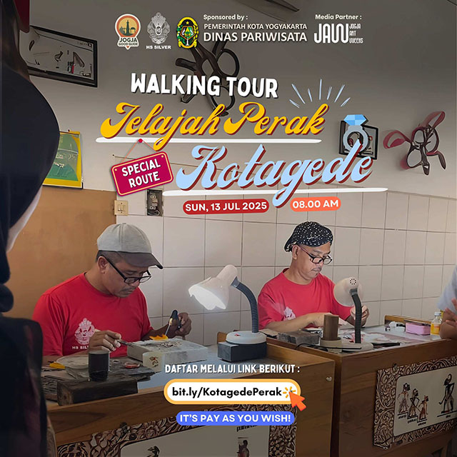 Jogja Good Guide bersama Dinas Pariwisata Kota Yogyakarta mengadakan event spesial Jelajah Perak Kotagede pada Minggu, 13 Juli 2025. Acara ini mengajak peserta menelusuri kekayaan sejarah dan budaya Kotagede melalui walking tour yang dimulai dari Museum Kotagede, menyaksikan langsung proses pembuatan perak, hingga menyusuri gang-gang perkampungan bersejarah.