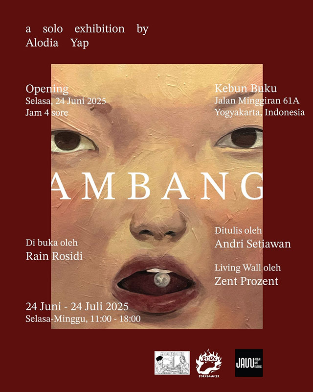 Sejak awal tahun 2024, setiap dua bulan sekali, Kebun Buku, sebuah toko buku yang juga berfungsi sebagai kedai kopi dan galeri telah membuat program pameran seni rupa dan mural (Living Wall) bernama Berkebunrupa. Seniman-seniman yang terlibat telah dipilih oleh sang pemilik Hans Knegmants dibantu oleh Patub Porx sebagai art organizer. Bulan Juni 2025 ini Berkebunrupa telah memasuki sesi ke-8 dan mengundang Alodia Yap, perupa perempuan asal Salatiga untuk mempresentasikan karya-karya visualnya di dalam ruang toko buku berkolaborasi secara ide dengan Zent Prozent, seorang street artist yang berkarya mural di luar tembok toko buku. Pameran bertajuk "AMBANG" ini diselenggarakan selama satu bulan penuh dari tanggal 24 Juni sampai 24 Juli 2025 dan dibuka oleh seorang seniman, kurator sekaligus pengajar seni Rain Rosidi. Untuk menghantarkan publik memahami tema kuratorial dan gagasan seniman, seorang penulis muda bernama Andri Setiawan membantu merangkumnya di tulisan pengantar pameran.