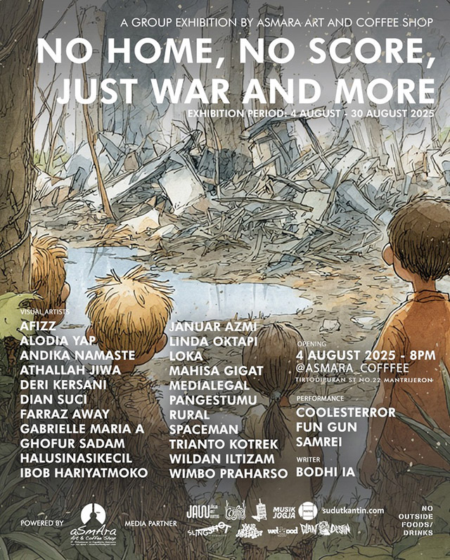 Perang bukan hanya tentang peluru dan darah. Ia adalah propaganda yang dikemas rapi, dijual dengan jargon patriotisme, dan dibeli dengan tubuh anak-anak. Kita hidup di dunia di mana setiap bom yang dijatuhkan disusul oleh konferensi pers yang menyalahkan korban atas kehancurannya sendiri. “Ketika dunia kehilangan skor, yang tersisa hanyalah dentang jam menuju kehancuran berikutnya.” Maka tengoklah pameran ini bukan untuk mencari harapan, tetapi untuk menatap luka tanpa berkedip.Karena hari ini, satu-satunya rumah yang tersisa adalah ingatan.