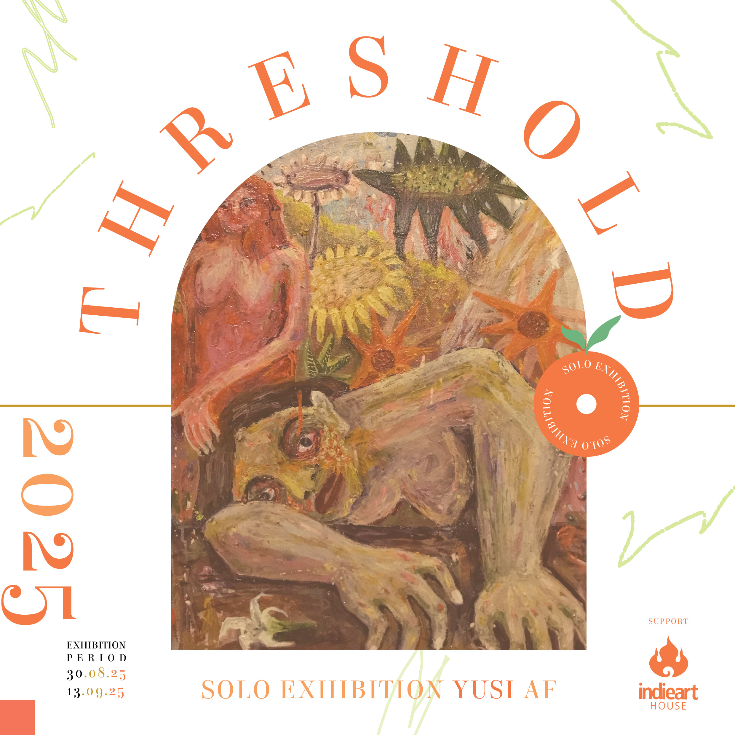 "Threshold" merefleksikan fase transisi dalam kehidupan, sebuah titik ambang antara awal, tengah, dan akhir. Melalui sapuan tekstur dan eksplorasi visual yang intuitif, Yusi AF menghadirkan perjalanan batin tentang keberanian melangkah, keraguan, dan pencarian makna. Setiap karya menjadi ruang kontemplasi, mengajak penonton menyelami batas antara takut dan berani, diam dan melangkah.
