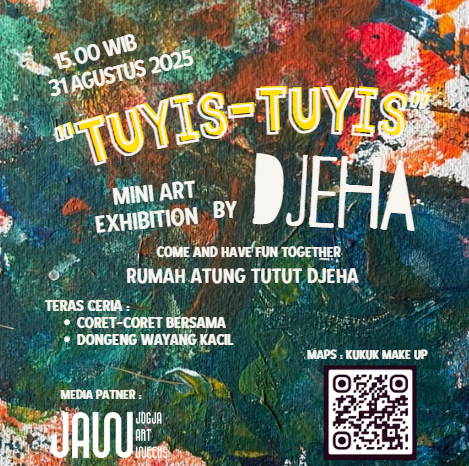 Pameran kecil ini akan berlangsung di garasi rumah simbah DJEHA—tempat yang penuh kenangan dan kehangatan keluarga. “Tuyis-Tuyis” adalah pameran kecil yang merayakan ekspresi awal DJEHA dalam bentuk coretan spontan, penuh rasa ingin tahu, dan bebas dari batasan konvensional. “Tuyis-Tuyis” adalah label yang diberikan oleh DJEHA sendiri dan berasal dari pelafalan unik DJEHA terhadap kata “tulis-tulis”, yang ia gunakan untuk menyebut aktivitas mencoret-coret—sebuah tindakan yang bagi anak usia dua tahun tidak sekadar bermain, melainkan juga bentuk komunikasi, eksplorasi, dan penciptaan dunia.